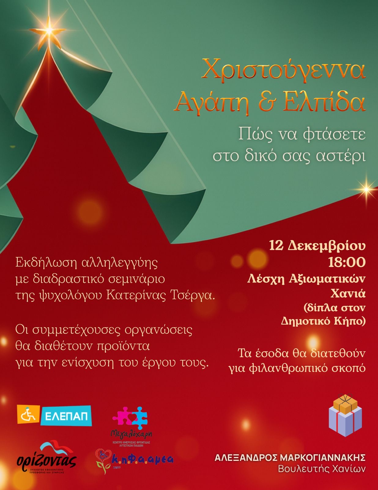 Την Παρασκευή 12 Δεκεμβρίου στις 18:00 σας περιμένω με χαρά για τσάι, καφέ και γλυκό σε μια χριστουγεννιάτικη συνάντηση αλληλεγγύης και αγάπης στη Λέσχη Αξιωματικών Χανίων.