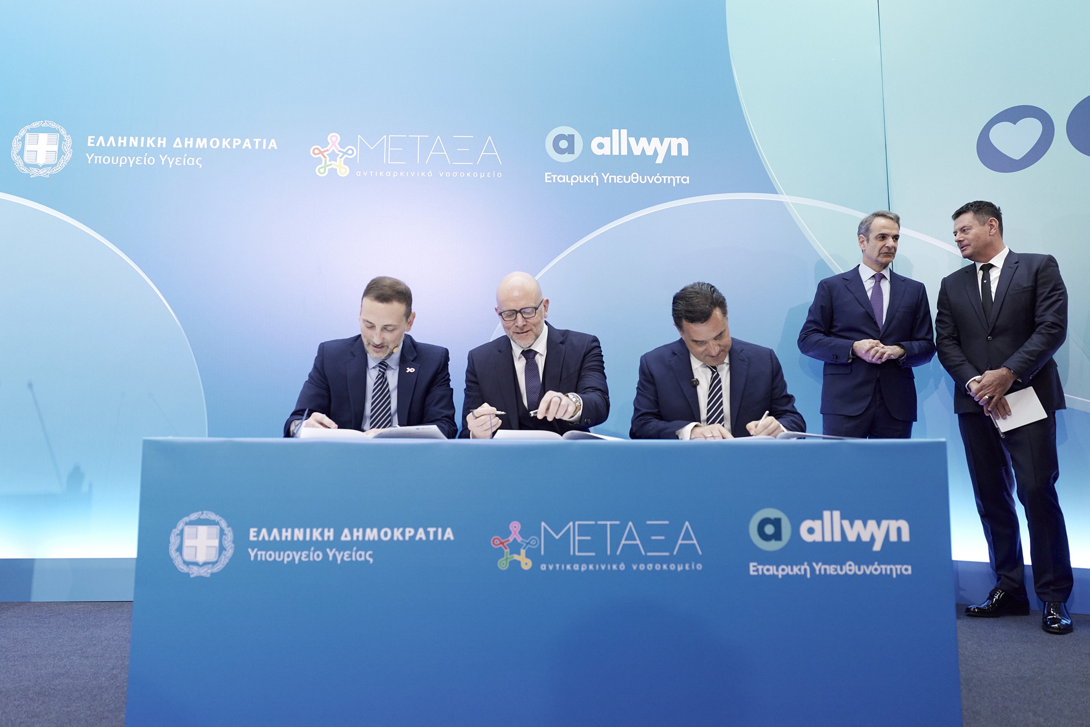 Υπογραφή μνημονίου συνεργασίας από τους Σαράντο Ευσταθόπουλο, Διοικητή του Αντικαρκινικού Νοσοκομείου «Μεταξά», Jan Karas, Πρόεδρο και Διευθύνοντα Σύμβουλο της Allwyn στην Ελλάδα και Άδωνι Γεωργιάδη, Υπουργό Υγείας, παρουσία του Πρωθυπουργού, Κυριάκου Μητσοτάκη και του Ιδρυτή και Προέδρου της Allwyn, Karel Komarek