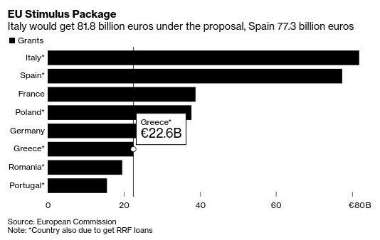 Συνολικά από τα 750 δισεκ. ευρώ που αναμένεται να δανειστεί η Κομισιόν για το ταμείο ανάκαμψης, η Ιταλία θα λάβει 173 δισεκ., από τα οποία τα 82 θα είναι επιχορηγήσεις και τα 91 δισεκ. θα είναι δάνεια. Η Ισπανία μπορεί να λάβει συνολικά 140 δισεκ. ευρώ, από τα οποία τα 77 δισεκ. θα είναι επιχορηγήσεις και τα 63 δισεκ. δάνεια.