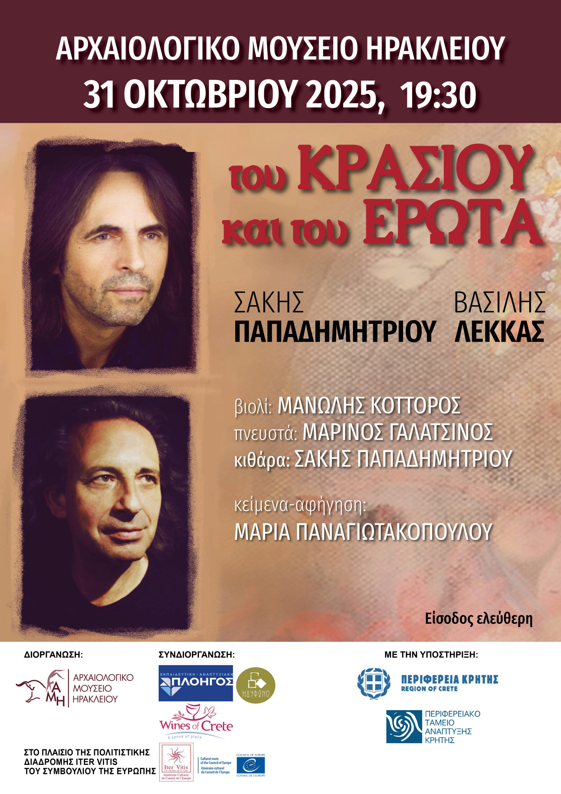 Το Αρχαιολογικό Μουσείο Ηρακλείου, σε συνδιοργάνωση με την Εκπαιδευτική/Αναπτυξιακή Πλοηγός, την ΑΜΚΕ «Ηδύφωνο» (μέλη της Πολιτιστικής Διαδρομής Iter Vitis του Συμβουλίου της Ευρώπης) και το Δίκτυο Οινοποιών Κρήτης Wines of Crete, με την υποστήριξη της Περιφέρειας Κρήτης, παρουσιάζουν το μουσικό έργο των Σάκη Παπαδημητρίου – Βασίλη Λέκκα «του ΚΡΑΣΙΟΥ και του ΕΡΩΤΑ».