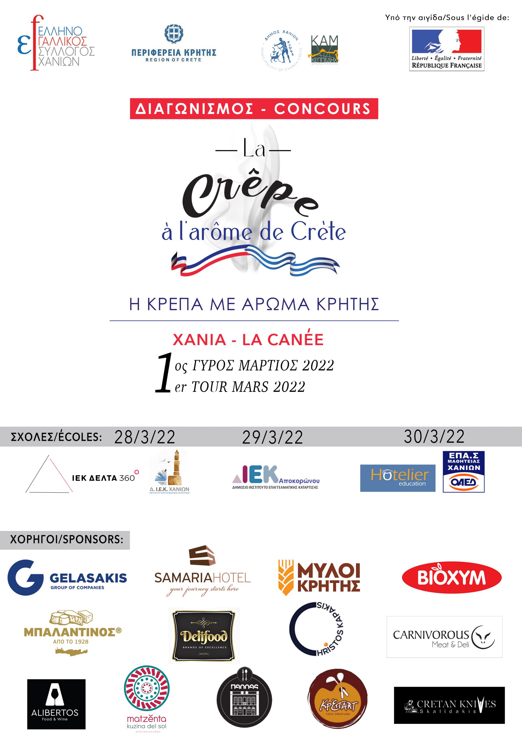 Στα πλαίσια της ανάδειξης του ελληνικού και του γαλλικού πολιτιστικού γίγνεσθαι και τη σύσφιξη των σχέσεων με φορείς των δύο χωρών, ο Ελληνο – Γαλλικός Σύλλογος Χανίων διοργανώνει το διαγωνισμό «Κρέπα με άρωμα Κρήτης». Η εκδήλωση θα πραγματοποιηθεί σε συνεργασία με την Περιφερειακή Ενότητα Χανίων, το Δήμο Χανίων και την ΚΕΠΠΕΔΗΧ-ΚΑΜ και τελεί υπό την αιγίδα της Γαλλικής Πρεσβείας στην Ελλάδα.