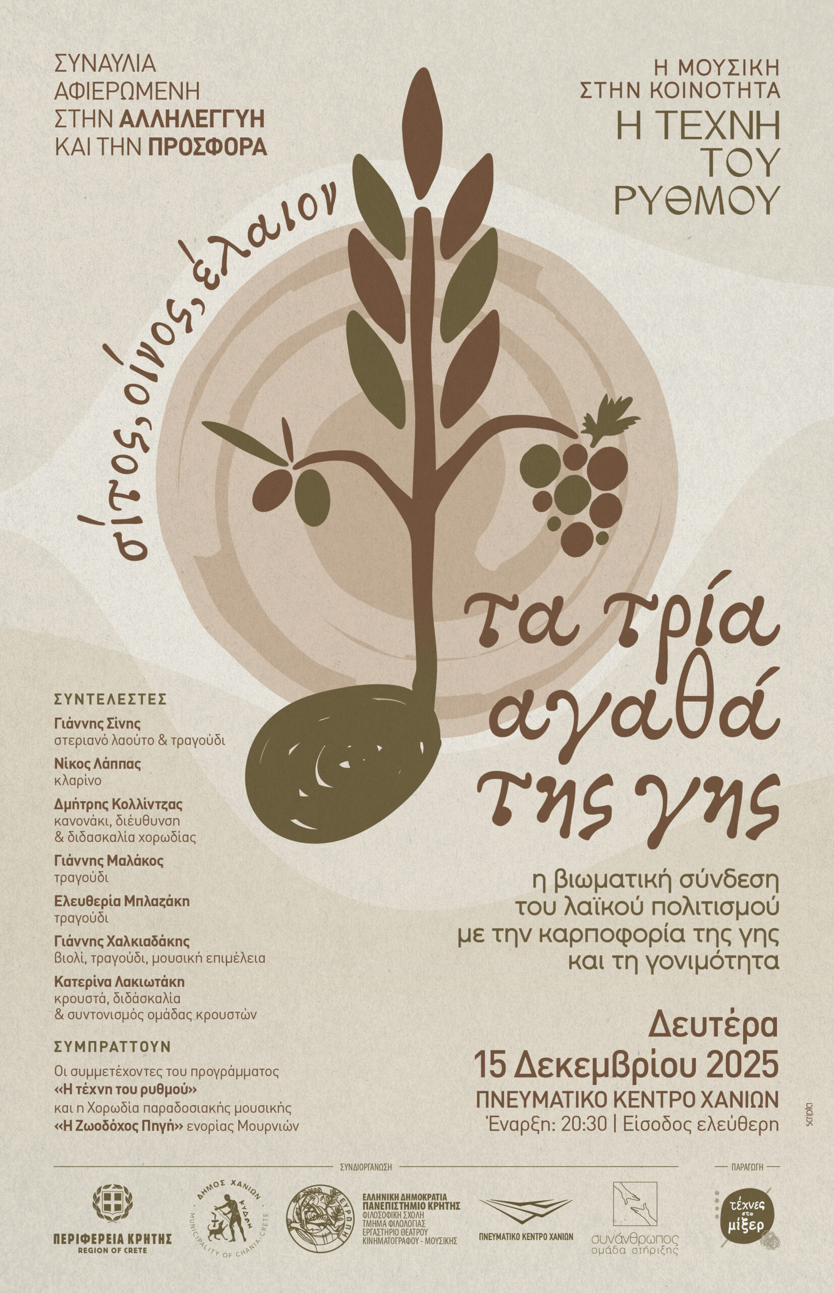 Η βιωματική σύνδεση του λαϊκού μας πολιτισμού με την καρποφορία της γης και τη γονιμότητα αναδεικνύεται μέσα από τις Μουσικές και τα Τραγούδια Συναυλίας αφιερωμένης στην Αλληλεγγύη και την Προσφορά που θα πραγματοποιηθεί τη Δευτέρα 15 Δεκεμβρίου 2025, ώρα 20.30, στο Πνευματικό Κέντρο Χανίων.