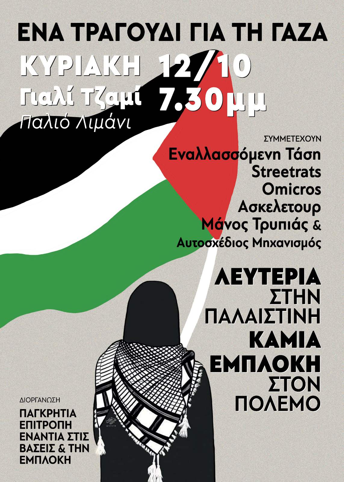 Χανιά:Συναυλία αλληλεγγύης στον Παλαιστινιακό λαό «ΕΝΑ ΤΡΑΓΟΥΔΙ ΓΙΑ ΤΗ ΓΑΖΑ» Κυριακή 12 Οκτωβρίου, στις 19:30 στο Γιαλί Τζαμί