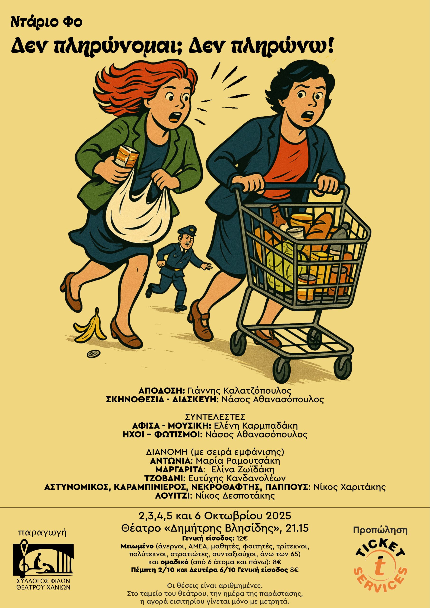 Οι θέσεις είναι αριθμημένες. Στο ταμείο του θεάτρου, την ημέρα της παράστασης, η αγορά εισιτηρίου γίνεται μόνο με μετρητά.