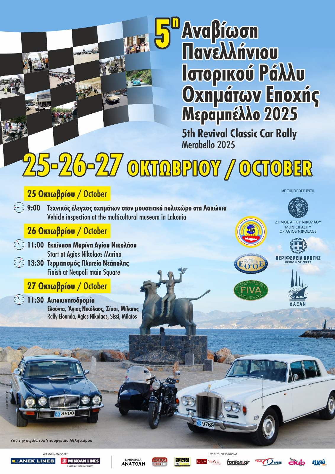 Η Ελληνική Ομοσπονδία Οχημάτων Εποχής (Ε.Ο.Ο.Ε.), σε συνεργασία με τον Παγκρήτιο Σύλλογο Οχημάτων Εποχής (ΠΑ.Σ.Ο.Ε.) και με την υποστήριξη του Δήμου Αγίου Νικολάου, της Δ.Α.Ε.Α.Ν. και της Περιφέρειας Κρήτης, ανακοινώνουν τη διοργάνωση της 5ης Αναβίωσης του Πανελλήνιου Ράλλυ Οχημάτων Εποχής “ΜΕΡΑΜΠΕΛΛΟ 2025”, που θα πραγματοποιηθεί στις 25, 26 και 27 Οκτωβρίου 2025.