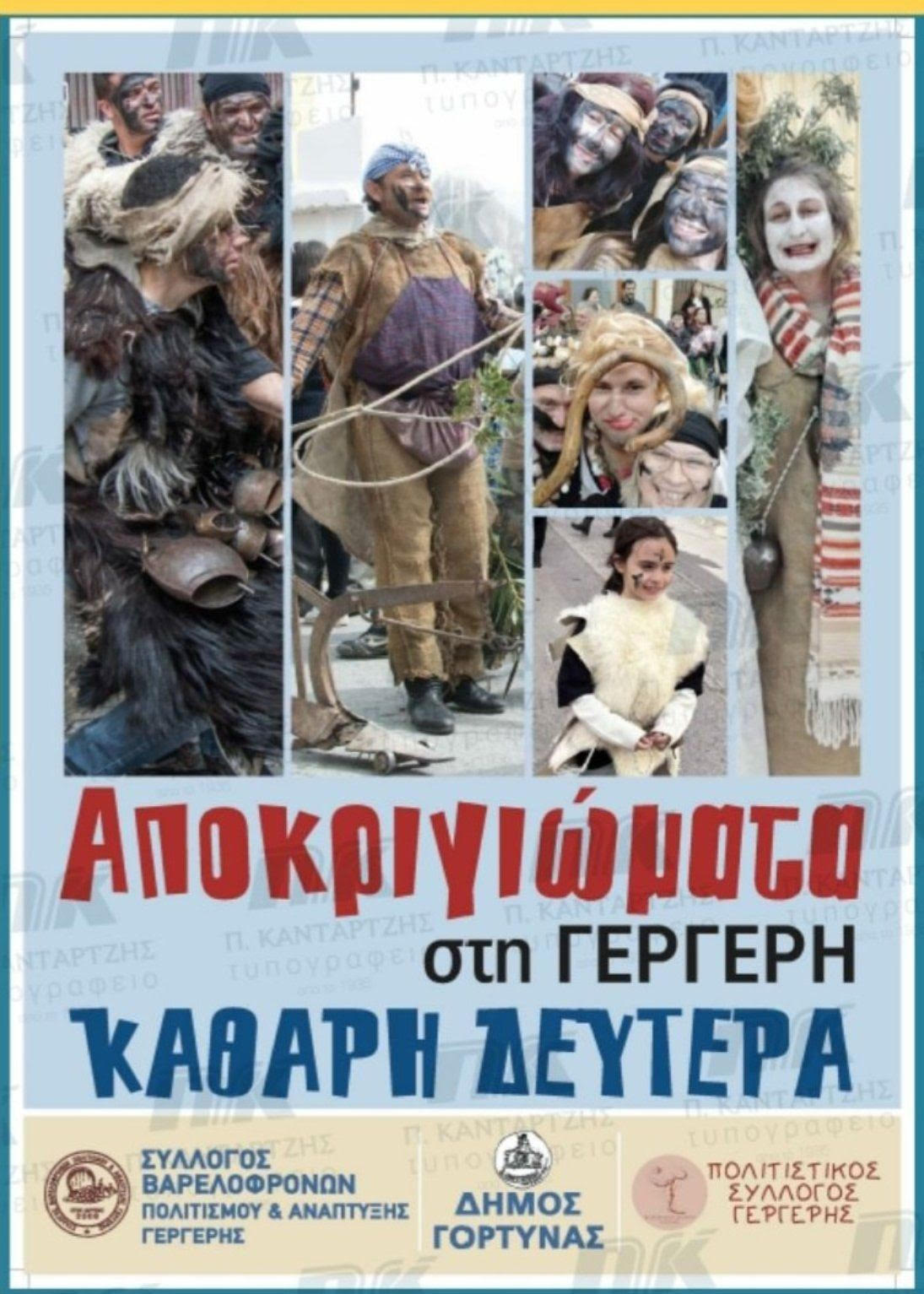 Ο Σύλλογος Βαρελοφρόνων Πολιτισμού & Ανάπτυξης Γέργερης, ο Δήμος Γόρτυνας και ο Πολιτιστικός Σύλλογος Γέργερης, σας προσκαλούν, την Καθαρά Δευτέρα 23 Φεβρουαρίου 2026, στα Αποκριγιώματα, στην Γέργερη.