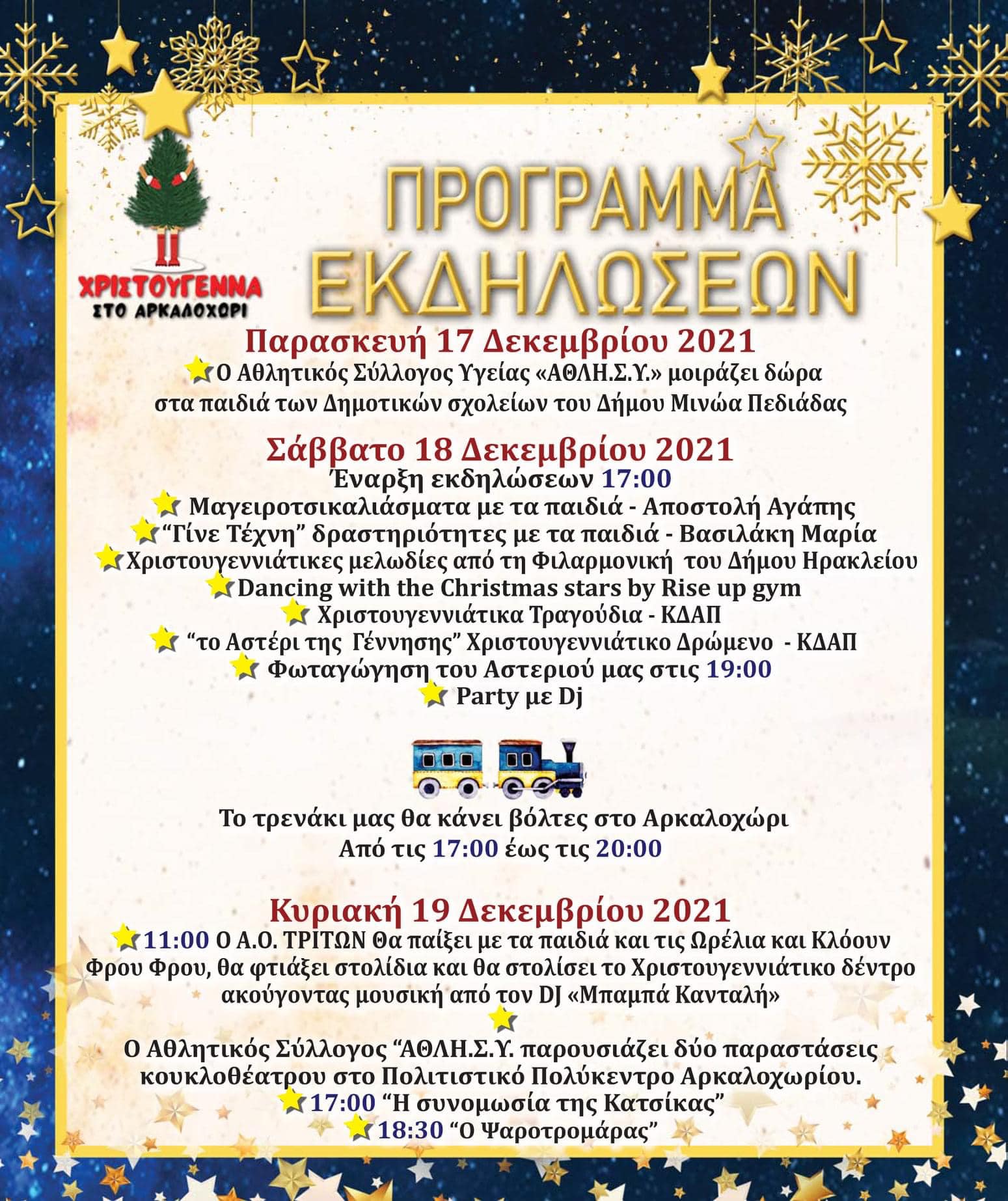 Οι χριστουγεννιάτικες εκδηλώσεις, που πραγματοποιούνται για να χαρίσουν στιγμές χαράς και ευτυχίας σε μικρούς και μεγάλους, είναι πλούσιες και ξεκινούν την Παρασκευή 17 Δεκεμβρίου,, με τον Αθλητικό Σύλλογο Υγείας «ΑΘΛΗ.Σ.Υ» να μοιράζει δώρα στα παιδιά των Δημοτικών Σχολείων του Δήμου Μινώα Πεδιάδας.