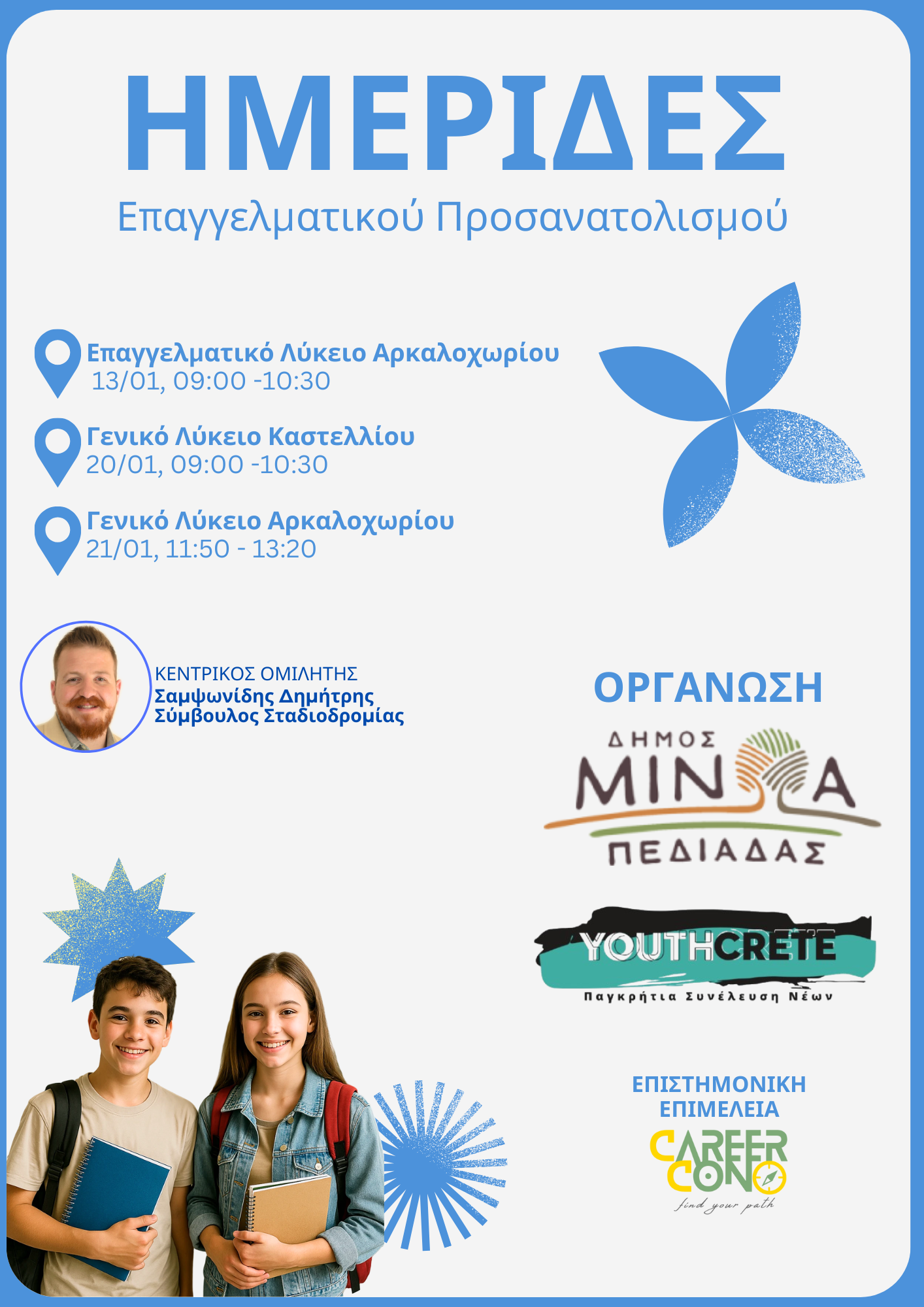 Το Youth Crete, με κεντρικό ομιλητή τον Σύμβουλο Σταδιοδρομίας κ. Δημήτρη Σαμψωνίδη, θα επισκεφθεί τα σχολεία του Δήμου, τις παρακάτω ημερομηνίες: