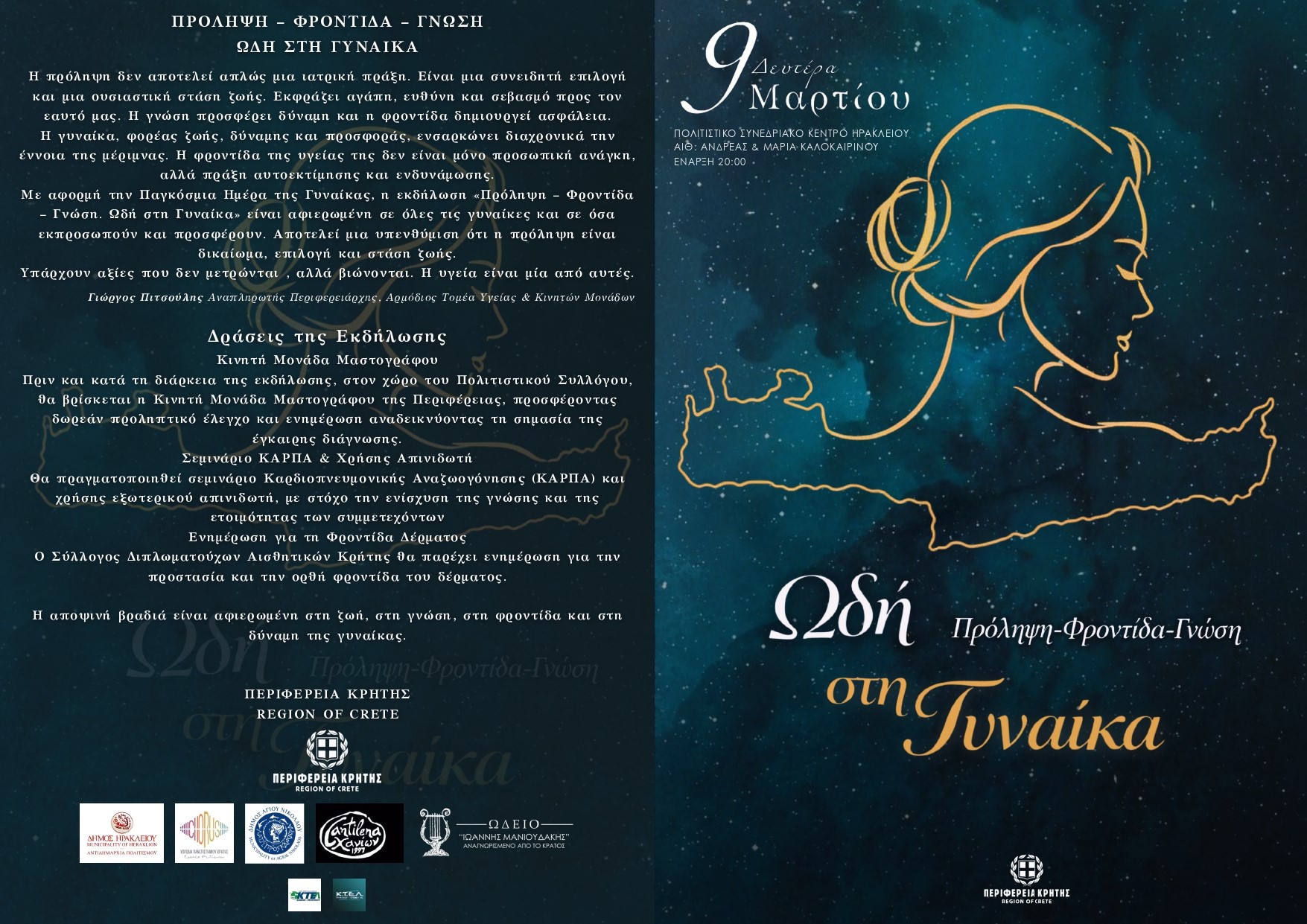 Με αφορμή την Παγκόσμια Ημέρα της Γυναίκας, η Περιφέρεια Κρήτης διοργανώνει τη Δευτέρα 9 Μαρτίου 2026 και ώρα 20:00 εκδήλωση με θέμα: «Πρόληψη – Φροντίδα – Γνώση. Ωδή στη Γυναίκα».