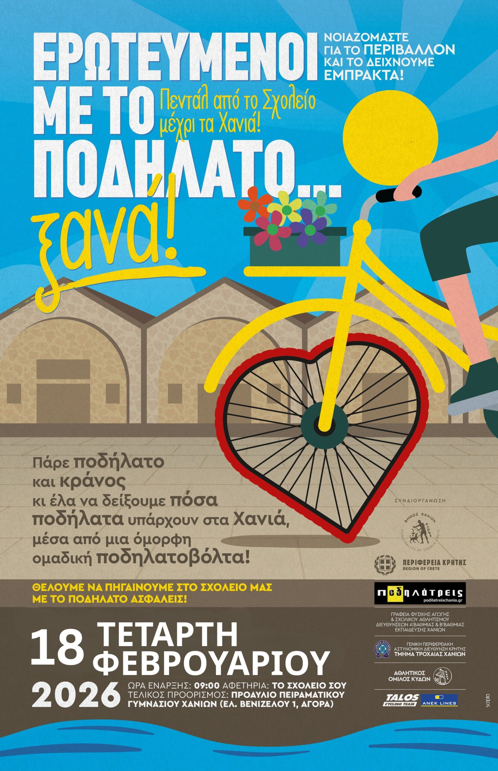 το Τμήμα Σχολικών Δραστηριοτήτων Α/θμιας Εκπαίδευσης Χανίων, τη Συλλογικότητα «ΠοδηΛάτρεις», τους Αθλητικούς Συλλόγους Ποδηλασίας Π.Ο.Χ. Τάλως ANEK LINES και Α.Ο. Κύδων διοργανώνουν για δεύτερη συνεχόμενη χρονιά την ποδηλατική δράση «Ερωτευμένοι με το Ποδήλατο».
