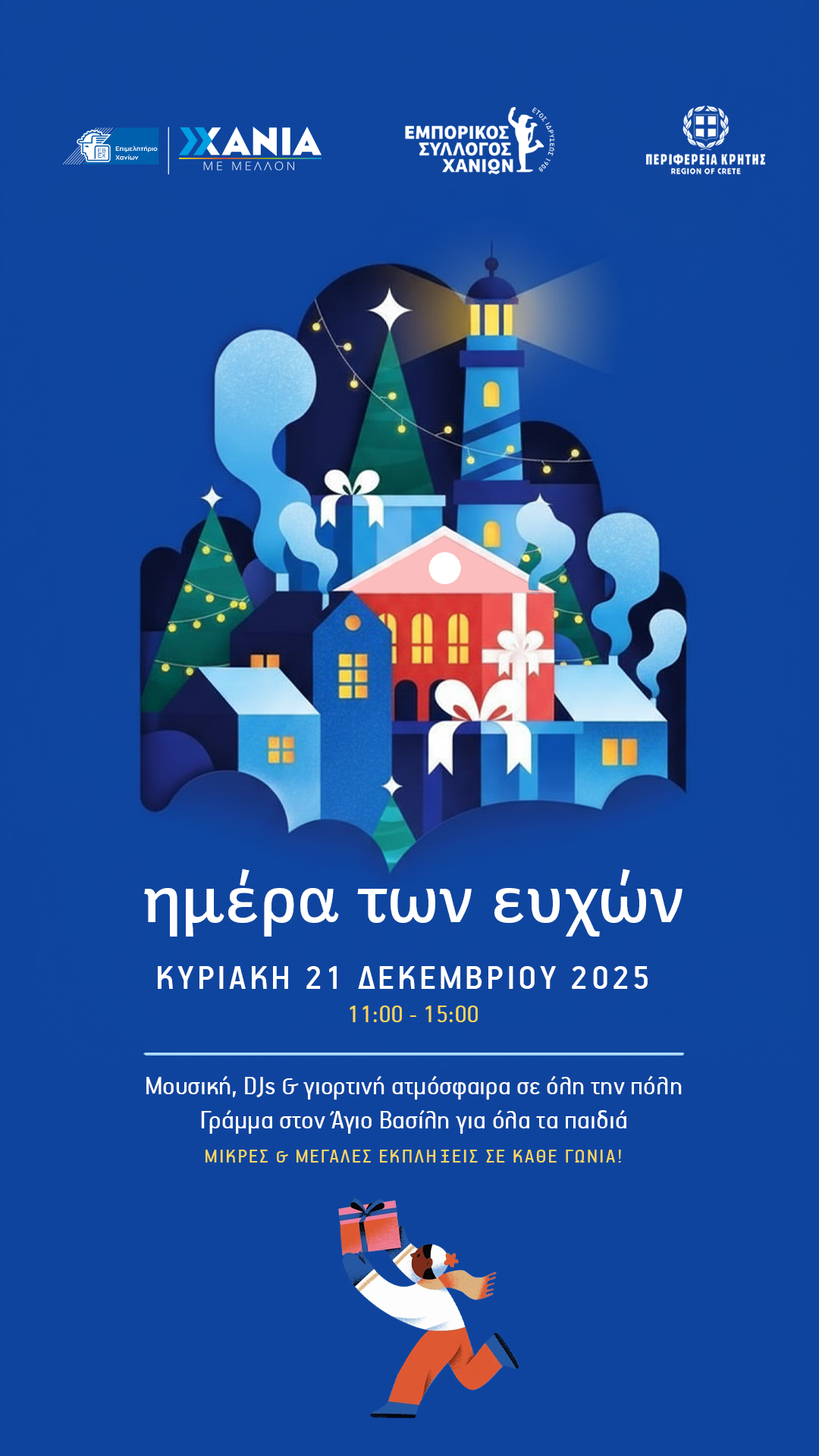 Κυριακή 21 Δεκεμβρίου Ημέρα των Ευχών, σας περιμένουμε όλους και σας ευχόμαστε Χρόνια Πολλά με Υγεία και Αγάπη», αναφέρει σε σχετική ανακοίνωση ο Εμπορικός Σύλλογος Χανίων.