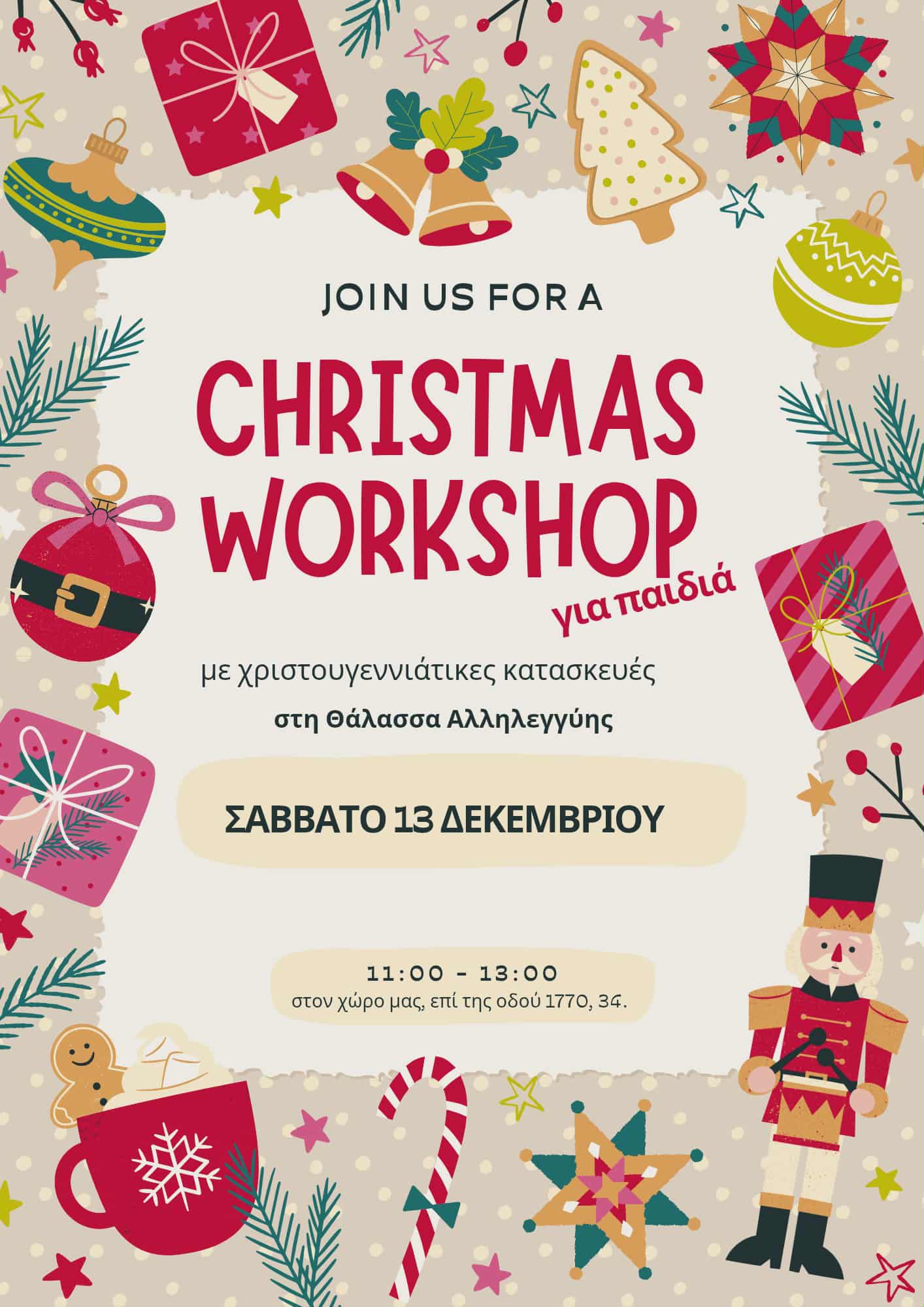 Παράλληλα για τους μικρούς μας φίλους, το Σάββατο από τις 11πμ – 1μμ. θα λάβει χώρα και το παιδικό μας εργαστήριο χριστουγεννιάτικης κατασκευής από τις εθελόντριες μας Ελευθερία και Καλλιόπη! (Σημ. Τα υλικά τα διαθέτουμε δωρεάν!)