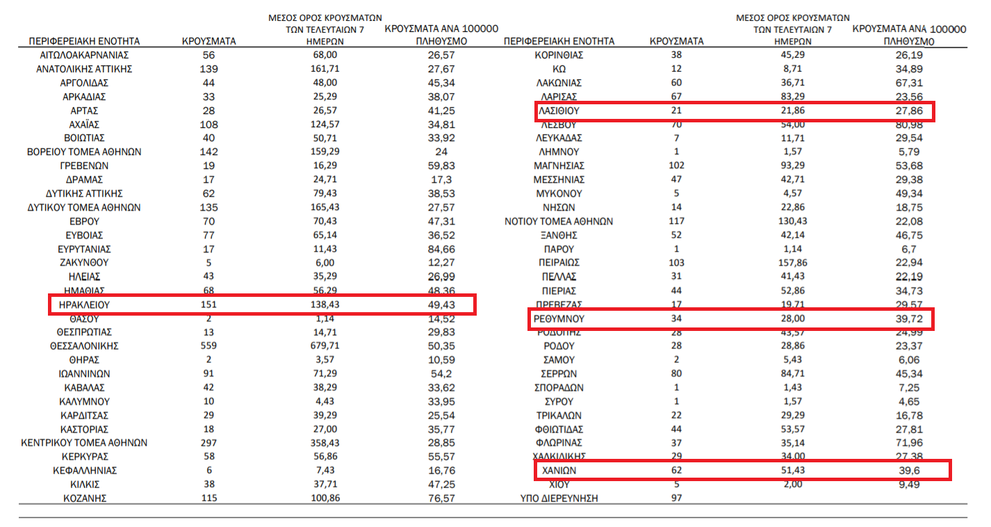 Σύμφωνα με τα στοιχεία της ημερήσιας έκθεσης επιδημιολογικής επιτήρησης τα κρούσματα στην Κρήτη κατανέμονται ως εξής: