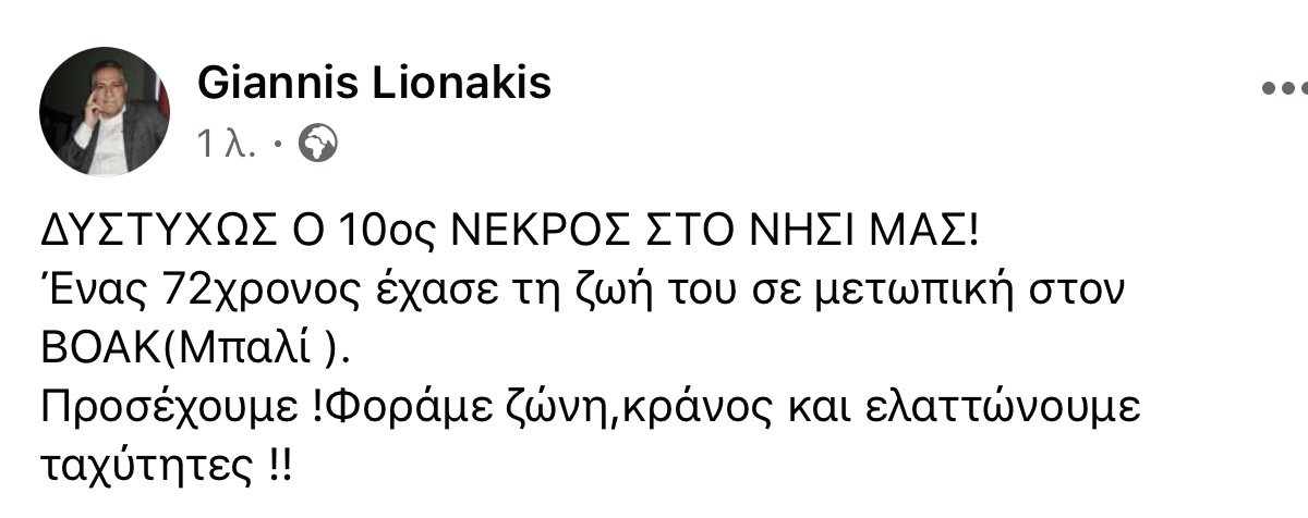Την δυσάρεστη είδηση σχολίασε με ανάρτησή του στα μέσα κοινωνικής δικτύωσης ο πρόεδρος του Συλλόγου Πρόληψης Τροχαίων Ατυχημάτων Γιάννης Λιονάκης.