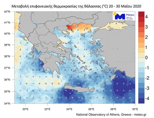 Η θερμοκρασία της επιφάνειας της θάλασσας υποχώρησε κατά την τελευταία εβδομάδα του Μαΐου έως και πέντε βαθμούς Κελσίου σε αρκετές περιοχές της Ελλάδας, μετά τον καύσωνα που σημειώθηκε μεταξύ 17-22 Μαΐου, σύμφωνα με το meteo του Εθνικού Αστεροσκοπείου Αθηνών.