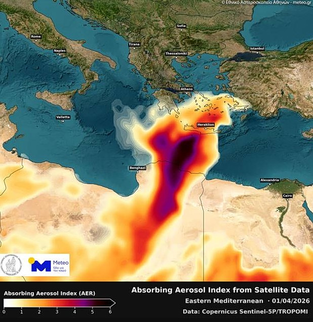 Και προσθέτει: «Αξιοποιώντας δορυφορικά δεδομένα του Sentinel-5P του Ευρωπαϊκού προγράμματος Copernicus, παρουσιάζουμε στον χάρτη τον δείκτη Aerosol Index (AER) πάνω από την Ανατολική Μεσόγειο την Τετάρτη 01 Απριλίου 2026, λίγο πριν την κορύφωση του επεισοδίου».