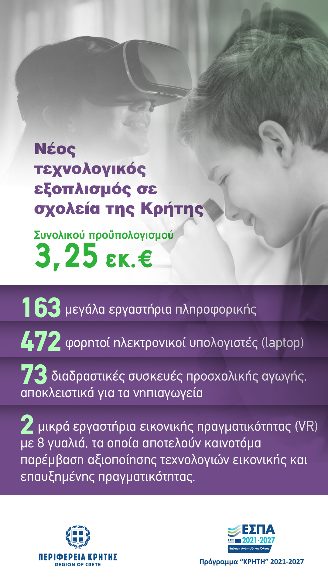 «Επενδύουμε στη νέα γενιά και στο μέλλον της Κρήτης, αναβαθμίζοντας έμπρακτα τη δημόσια εκπαίδευση. Με τη διάθεση 3,25 εκατομμυρίων ευρώ, εξοπλίζουμε τα σχολεία μας με σύγχρονα τεχνολογικά μέσα, διασφαλίζοντας ίσες ευκαιρίες πρόσβασης στη γνώση για τους μαθητές και μαθήτριες του νησιού. Στόχος μας είναι η δημιουργία ενός καινοτόμου, ψηφιακού και ελκυστικού σχολείου, που θα παρέχει στα παιδιά μας τα απαραίτητα εφόδια για να ανταποκριθούν στις προκλήσεις της σύγχρονης εποχής».