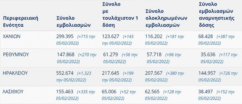 Θυμίζουμε ότι μέχρι την 1η Φεβρουαρίο το ποσοστό εμβολιαστικής κάλυψης με ολοκληρωμένους εμβολιασμούς ήταν στον νομό Χανίων (πλην του δήμου Γαύδου) 65%, στο Ρέθυμνο το 64%, στο Ηράκλειο το 68% και στο Λασίθι το72%.