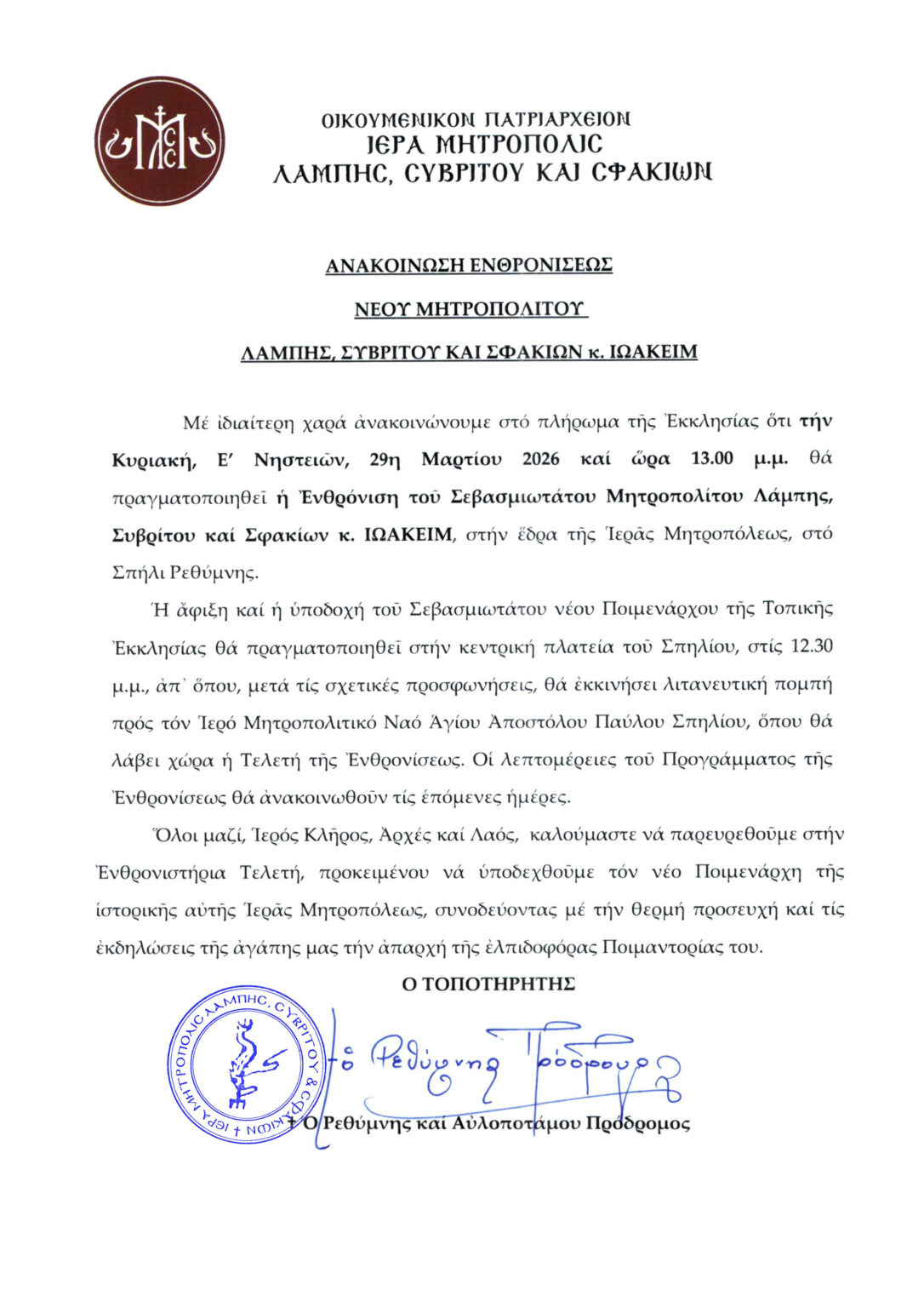 ΚΡΗΤΗΡΕΘΥΜΝΟ Ρέθυμνο:Ανακοίνωση Ενθρονίσεως Σεβ. Μητροπολίτου Λάμπης, Συβρίτου και Σφακίων κ. Ιωακείμ Από: Team Πολ. Κρήτης Ημερομηνία: 13/03/2026 TagsανακοίνωσηΕνθρονίσεωςκ. ΙωακείμΣεβ. Μητροπολίτου Λάμπης Προηγούμενο Άρθροplaceholder text Επόμενο Άρθροplaceholder text Ηράκλειο:Εργασίες στην λεωφόρο Νικολάου Πλαστήρα από τη... 17 λεπτά ago 0 Κυκλοφοριακές ρυθμίσεις το Σάββατο 14/3 Εργασίες σύνδεσης ύδρευσης και αποχέτευσης... Σταύρος Αρναουτάκης: «Η Κρήτη αναδεικνύεται σε απόλυτο... 20 λεπτά ago 0 Τον οραματικό και φιλόδοξο μετασχηματισμό που συντελείται στην Κρήτη,... Ηράκλειο:Εργασίες στην λεωφόρο Νικολάου Πλαστήρα από τη... 17 λεπτά ago 0 Κυκλοφοριακές ρυθμίσεις το Σάββατο 14/3 Εργασίες σύνδεσης ύδρευσης και αποχέτευσης... Σταύρος Αρναουτάκης: «Η Κρήτη αναδεικνύεται σε απόλυτο... 20 λεπτά ago 0 Τον οραματικό και φιλόδοξο μετασχηματισμό που συντελείται στην Κρήτη,... Προηγούμενο άρθροΧανιά:«Η παράσταση του ΔΗΠΕΘΕ Κρήτης “4 λεπτά & 12 δευτερόλεπτα” του Τζέιμς Φριτς, στο Πολύκεντρο Βουκολιών του Δήμου Πλατανιά”Επόμενο άρθροΕπίσκεψη κομματικών στελεχών στο έργο του Νέου Διεθνούς Αερολιμένα Ηρακλείου Team Πολ. Κρήτης Share post: FacebookTwitterPinterestWhatsApp SubscribeI want inI've read and accept the Privacy Policy. Popular Ηράκλειο:Εργασίες στην λεωφόρο Νικολάου Πλαστήρα από τη ΔΕΥΑΗ Σταύρος Αρναουτάκης: «Η Κρήτη αναδεικνύεται σε απόλυτο παγκόσμιο προορισμό εμπειριών και πολιτισμού» Επίσκεψη κομματικών στελεχών στο έργο του Νέου Διεθνούς Αερολιμένα Ηρακλείου Χανιά:«Η παράσταση του ΔΗΠΕΘΕ Κρήτης “4 λεπτά & 12 δευτερόλεπτα” του Τζέιμς Φριτς, στο Πολύκεντρο Βουκολιών του Δήμου Πλατανιά” Παρασκευή και 13: Γιατί θεωρείται γρουσούζικη – Η πτώση των Ναϊτών και η «διατάραξη» του δώδεκα More like thisRelated Ηράκλειο:Εργασίες στην λεωφόρο Νικολάου Πλαστήρα από τη ΔΕΥΑΗ Team Πολ. Κρήτης - 13/03/2026 Κυκλοφοριακές ρυθμίσεις το Σάββατο 14/3 Εργασίες σύνδεσης ύδρευσης και αποχέτευσης... Σταύρος Αρναουτάκης: «Η Κρήτη αναδεικνύεται σε απόλυτο παγκόσμιο προορισμό εμπειριών και πολιτισμού» Team Πολ. Κρήτης - 13/03/2026 Τον οραματικό και φιλόδοξο μετασχηματισμό που συντελείται στην Κρήτη,... Επίσκεψη κομματικών στελεχών στο έργο του Νέου Διεθνούς Αερολιμένα Ηρακλείου Team Πολ. Κρήτης - 13/03/2026 Με πρωτοβουλία του πρώην Υπουργού και Βουλευτή Ηρακλείου, Λευτέρη... Χανιά:«Η παράσταση του ΔΗΠΕΘΕ Κρήτης “4 λεπτά & 12 δευτερόλεπτα” του Τζέιμς Φριτς, στο Πολύκεντρο Βουκολιών του Δήμου Πλατανιά” Team Πολ. Κρήτης - 13/03/2026 Το ΔΗΠΕΘΕ Κρήτης παρουσιάζει, με τη στήριξη του Δήμου...