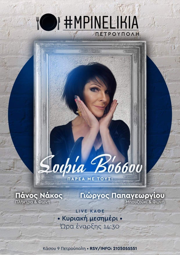 Η διαχρονική και πετυχημένη ερμηνεύτρια που δεν σταματά λεπτό να μας συντροφεύει μέσα από τα τραγούδια που επιλέγει ένα προς ένα για το κοινό της, κάθε Κυριακή μεσημέρι, συνεχίζει τις δυναμικές, επιτυχημένες sold out εμφανίσεις της, στο μουσικό μεζεδοπωλείο «Μπινελίκια» στην Πετρούπολη.