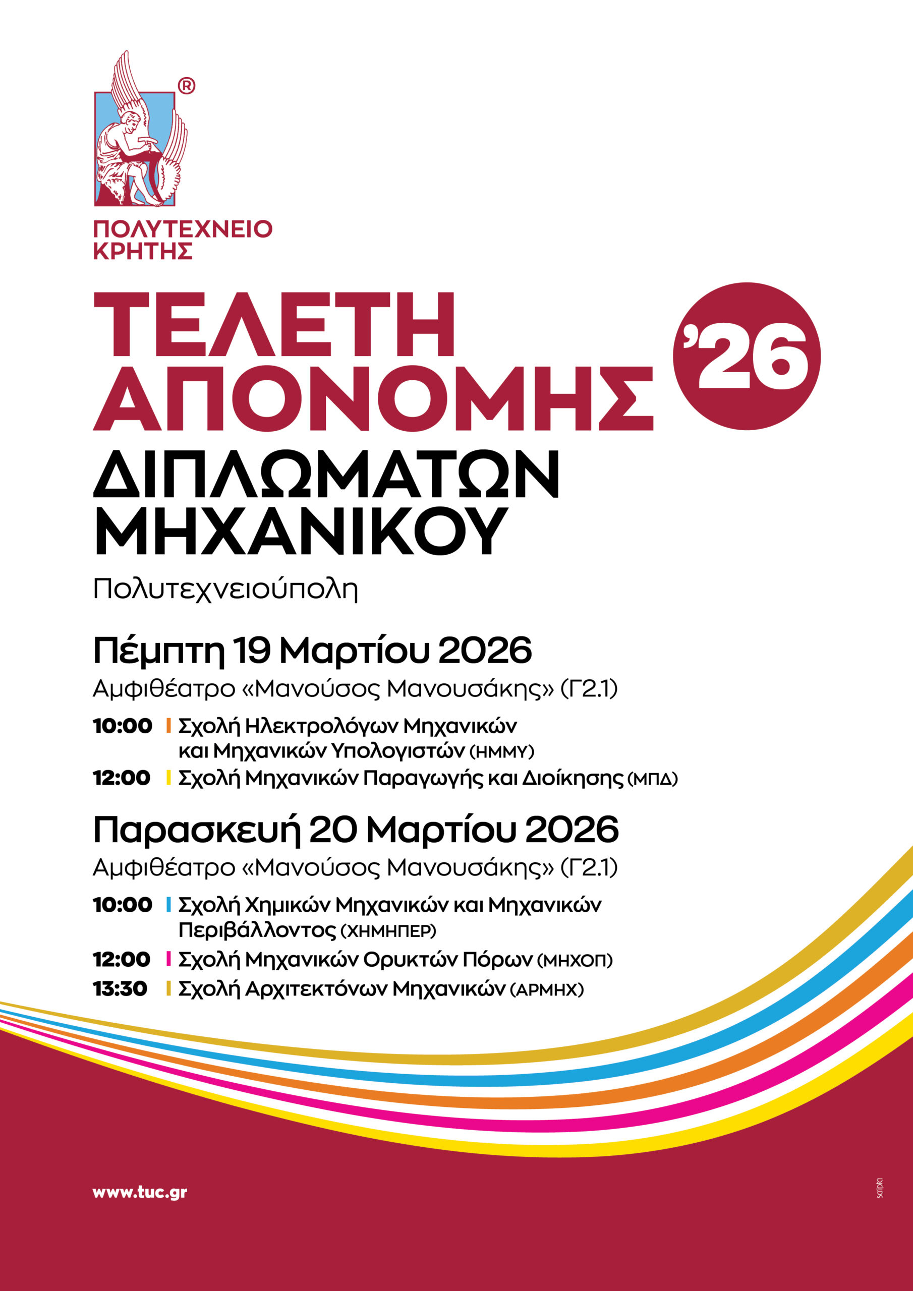 Η Τελετή Απονομής Διπλωμάτων Μηχανικού του Πολυτεχνείου Κρήτης για την ανακήρυξη της εξεταστικής του χειμερινού εξαμήνου 2025-2026, θα πραγματοποιηθεί την Πέμπτη 19 Μαρτίου 2026 και την Παρασκευή 20 Μαρτίου 2026, στο Αμφιθέατρο «Μανούσος Μανουσάκης» (Γ2.1) της Πολυτεχνειούπολης.
