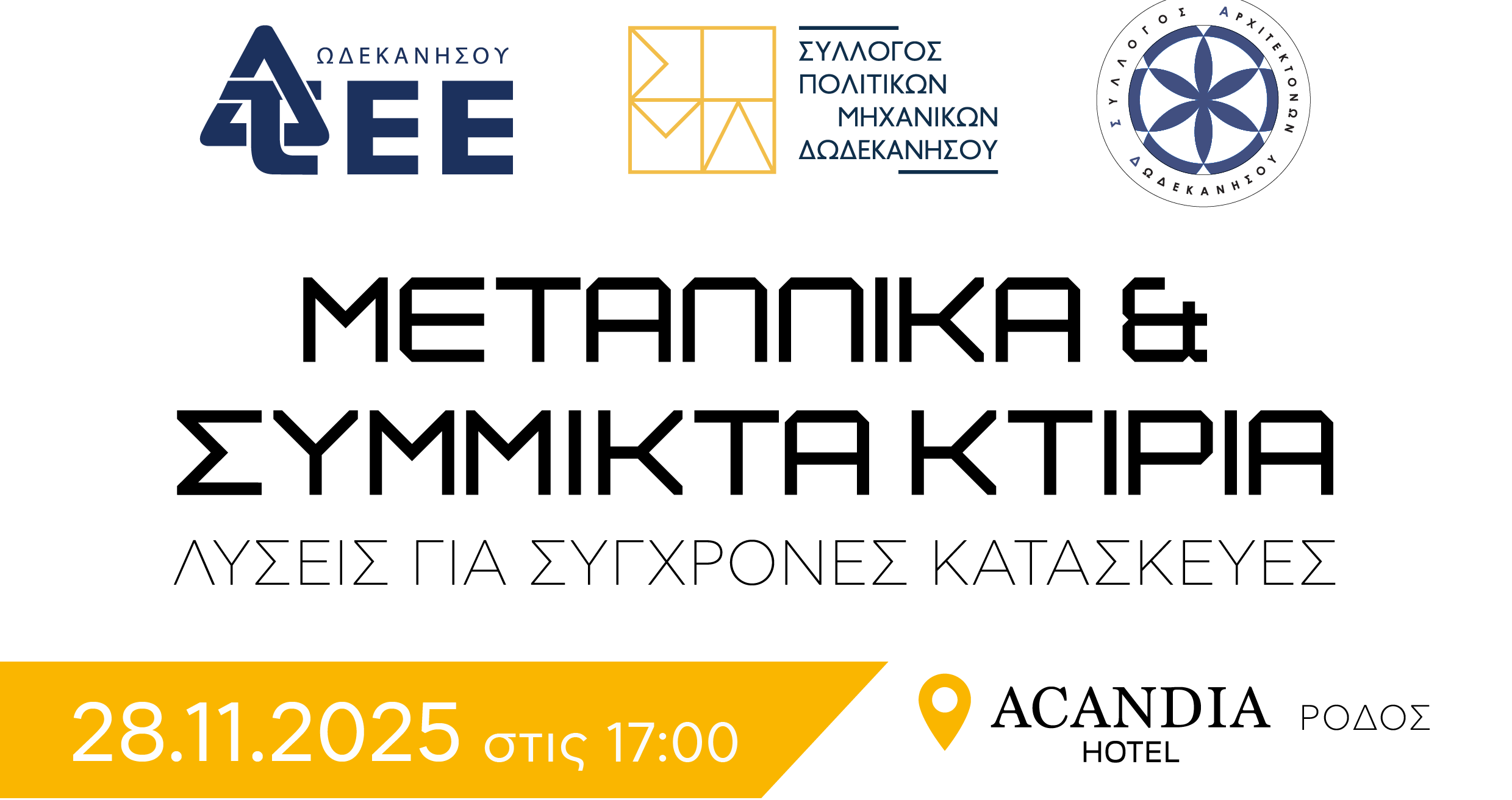 Οι εταιρείες Vavoulas Group [turn key construction] και Hatzimichail Architects + Engineers συμμετέχουν ως χορηγοί στην εσπερίδα που διοργανώνει το Τεχνικό Επιμελητήριο Ελλάδος – Τμήμα Δωδεκανήσου σε συνεργασία με τον Σύλλογο Πολιτικών Μηχανικών Δωδεκανήσου & τον Σύλλογο Αρχιτεκτόνων Δωδεκανήσου με τίτλο «Mεταλλικά & σύμμικτα κτίρια – Λύσεις για σύγχρονες κατασκευές», η οποία θαπραγματοποιηθεί στη Ρόδο, την Παρασκευή 28 Νοεμβρίου 2025, στις 17:00, στο ξενοδοχείο Acandia.