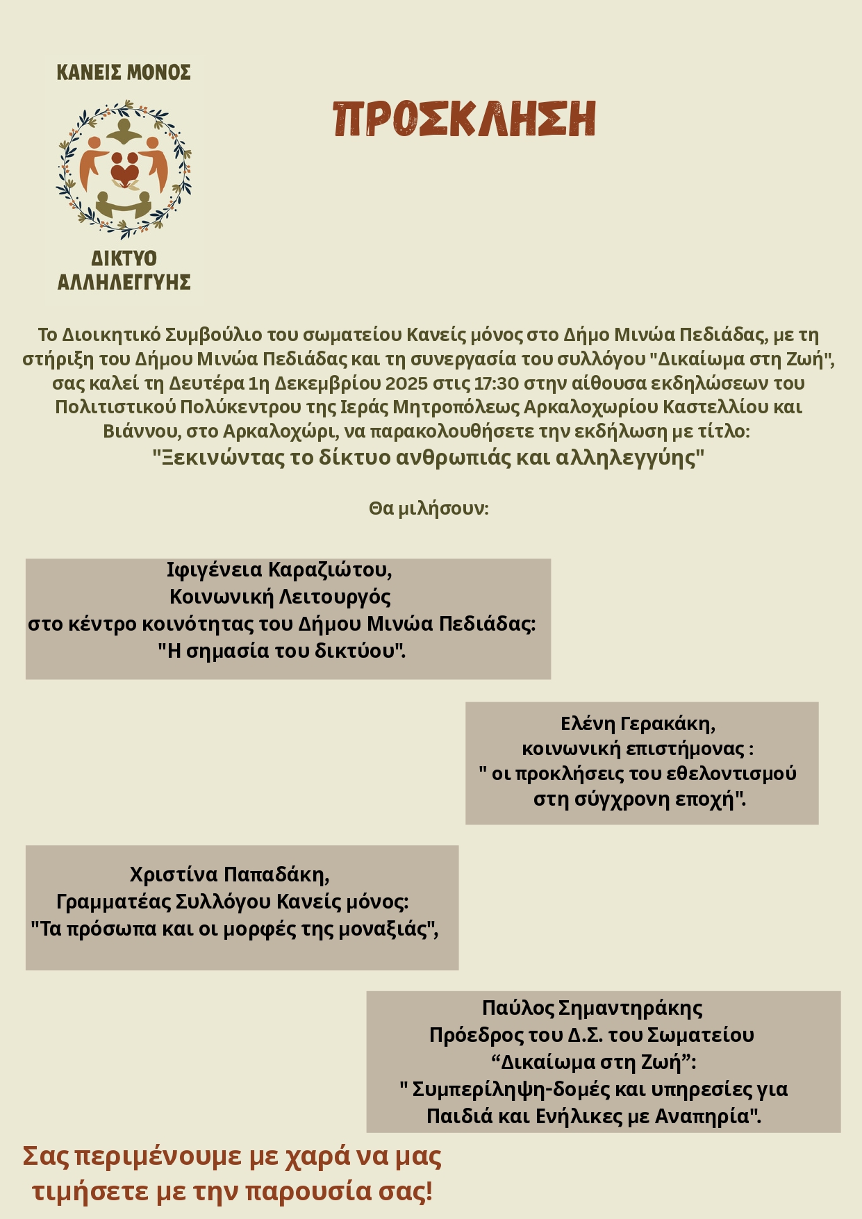 “ΚΑΝΕΙΣ ΜΟΝΟΣ ΣΤΟ ΔΗΜΟ ΜΙΝΩΑ ΠΕΔΙΑΔΑΣ”: “Ξεκινώντας ένα δίκτυο ανθρωπιάς και αλληλεγγύης”- Δράση ενημέρωσης και ευαισθητοποίησης, τη Δευτέρα 1 Δεκεμβρίου στις 17:30, στην αίθουσα εκδηλώσεων του Πολιτιστικού Πολύκεντρου της Ιεράς Μητροπόλεως Αρκαλοχωρίου, Καστελλίου και Βιάννου