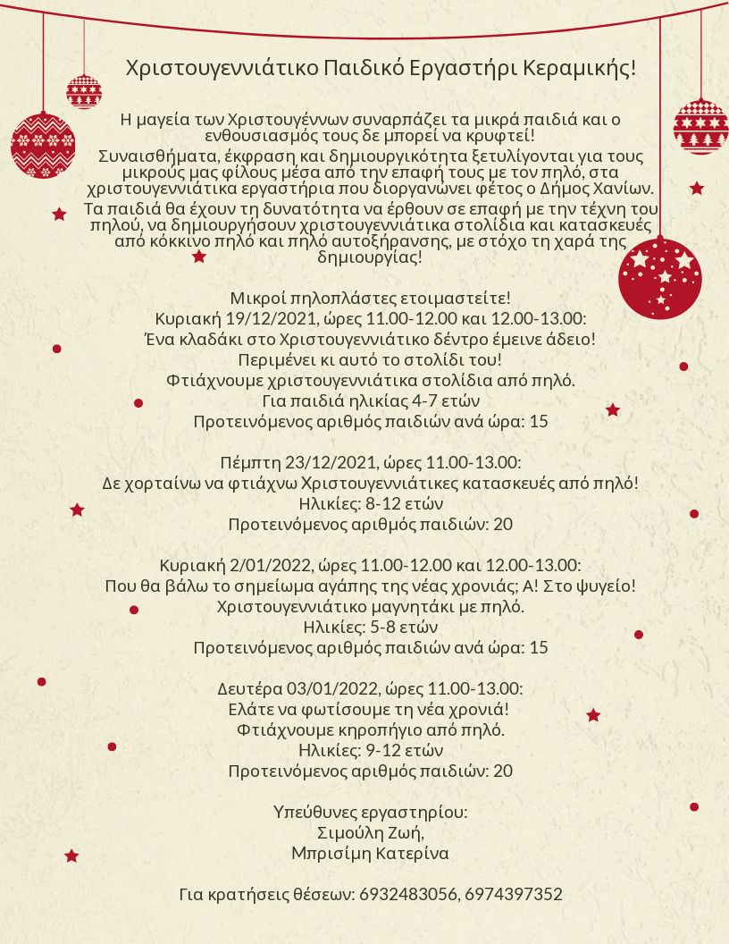 Τα παιδιά θα έχουν τη δυνατότητα να έρθουν σε επαφή με την τέχνη του πηλού, να δημιουργήσουν χριστουγεννιάτικα στολίδια και κατασκευές από κόκκινο πηλό και πηλό αυτοξήρανσης, με στόχο τη χαρά της δημιουργίας!
